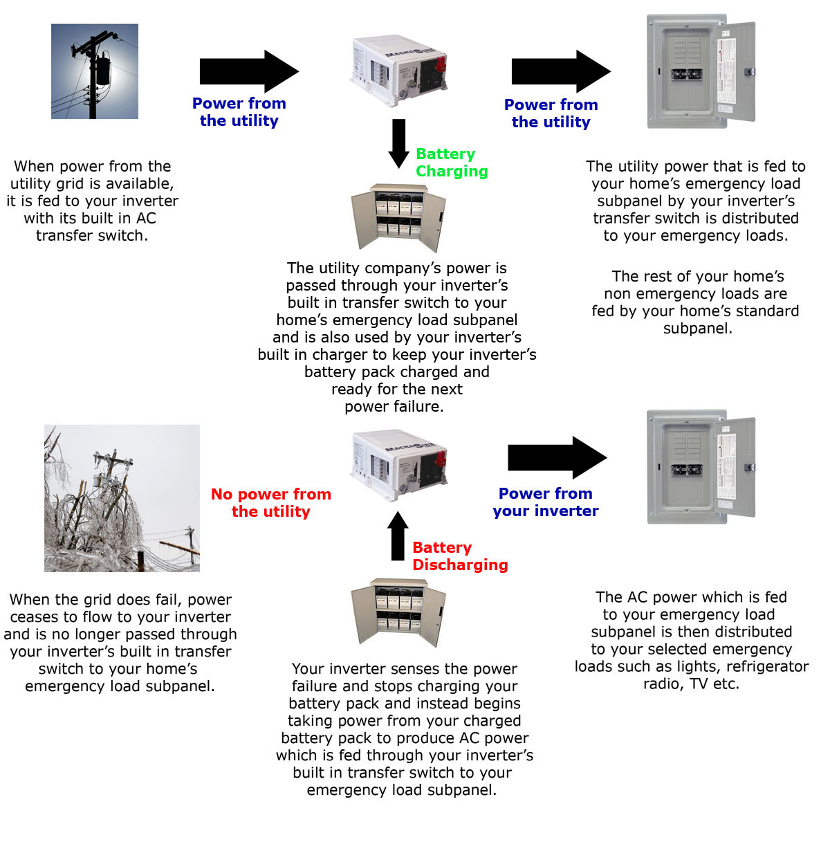 To summarize: When utility power is available, the power from the utility is passed through the inverter's built in transfer switch to power your home's protected loads. The utility power is also used by the inverter's built in battery charger to keep your inverter's battery pack charged and ready for the next power failure. When a power failure occurs, the inverter automatically begins converting DC power from your charged batteries into AC power that is used by your emergency loads such as your refrigerator, lights, radio, TV etc.